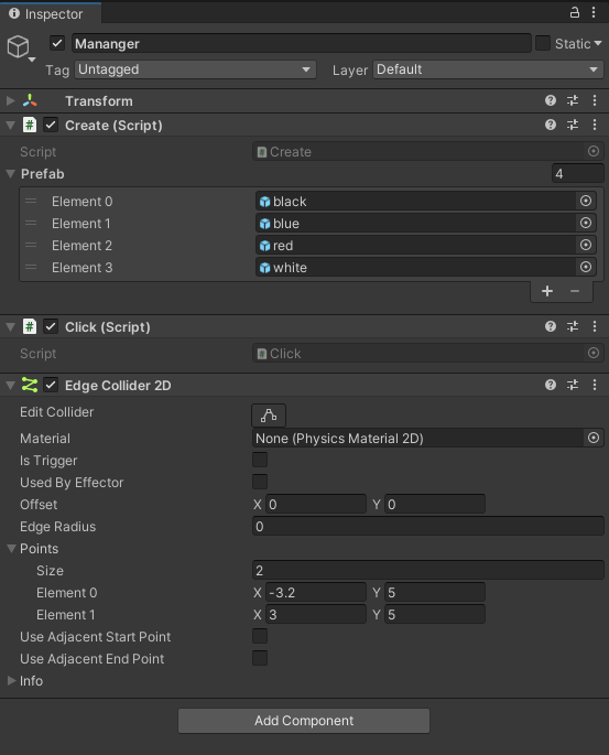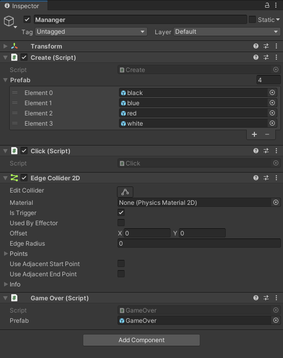 먼저 Manager에다 Edge Collider 2D를 넣습니다. (Is Trigger 체크)