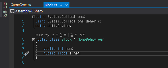 블럭에 적용된 스크립트에 public float time; 추가 합니다.