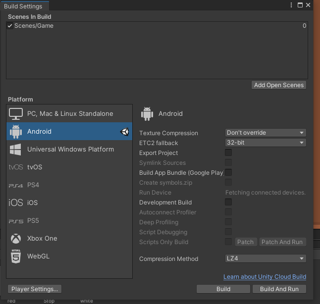 File - Build Settings에서 Add Open Scenes 해주셔야 씬 불러오기가 됩니다.