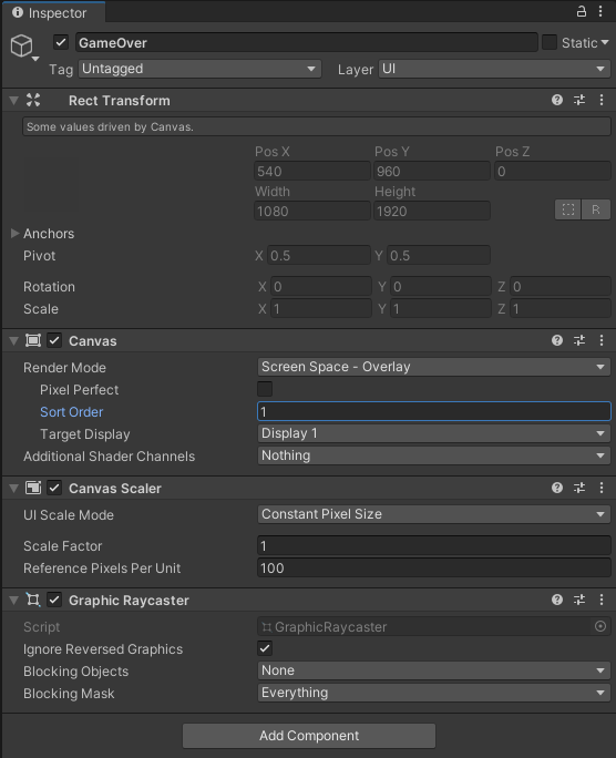 생성한 Canvas에서 Canvas - Sort Order의 값을 1로 변경합니다. 효과는 Canvas가 여러 개 있을 때