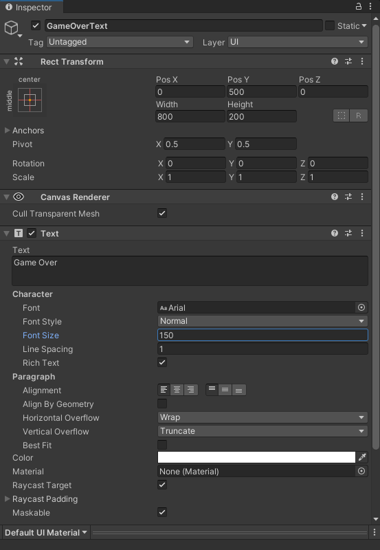 GameOver라는 문구를 화면에 표시하기 위해 Text - Text에서 문구를, Character에서 폰트 설정을 합니다.
