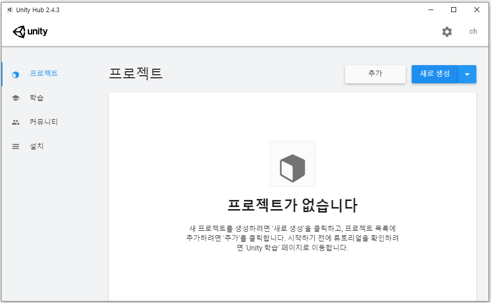 먼저 Unity Hub를 실행하시고 새로 생성을 클릭합니다.